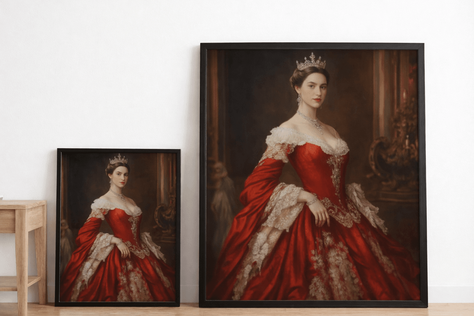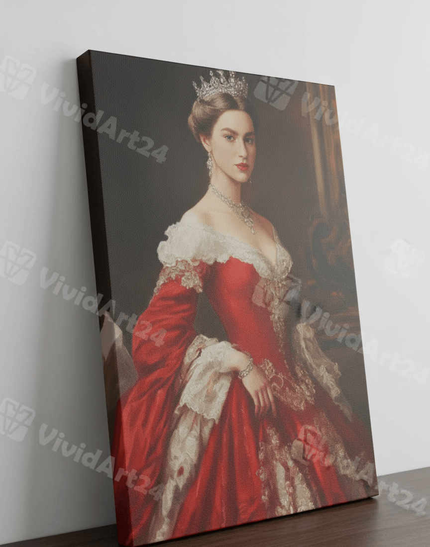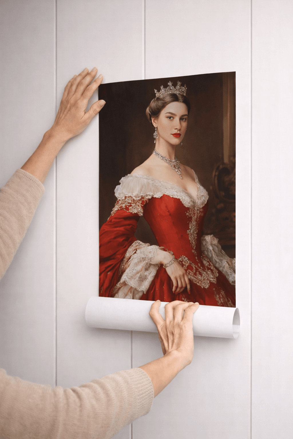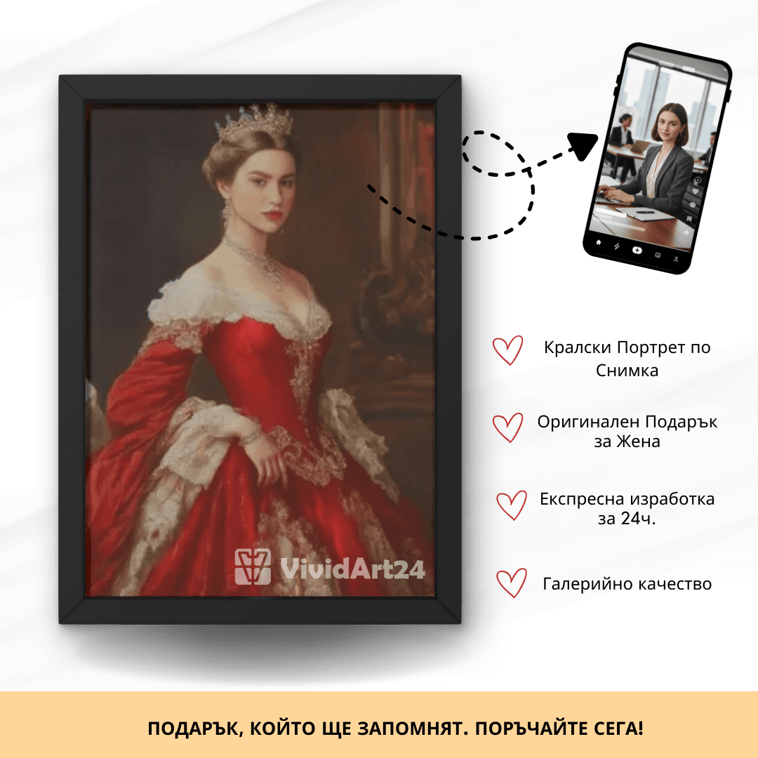 Превърнете своя снимка в изкуство с персонализиран портрет на жена в кралски стил. Нашите художници създават дигитални илюстрации с корона, трон, ренесансова или барокова рокля, които подчертават изящество и благородство. Идеален подарък за специален повод или елегантна декорация за дома.