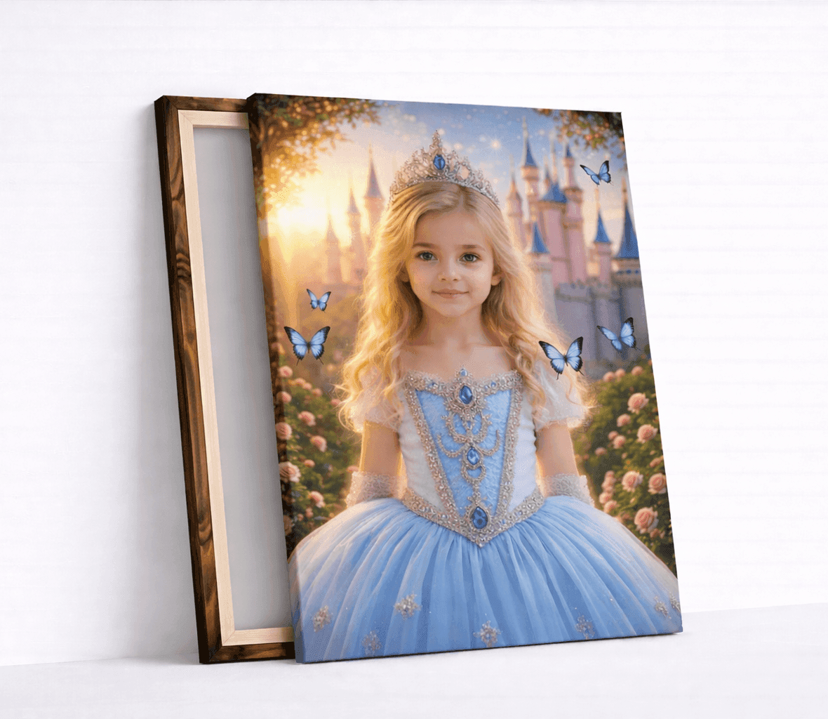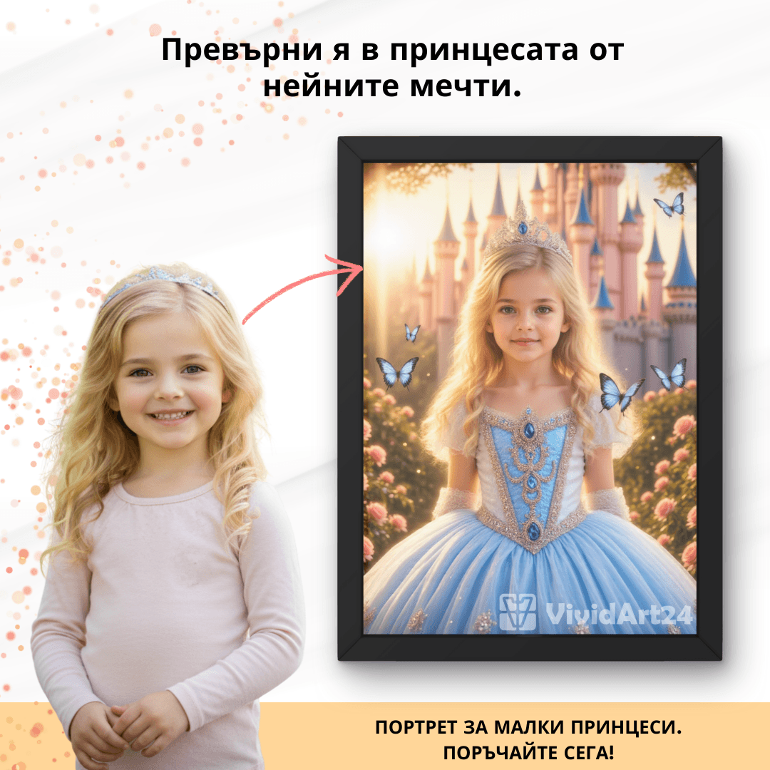 Превърни снимката на своето дете в вълшебен портрет в стил Пепеляшка – със синя рокля, корона, пеперуди и замък на заден план.