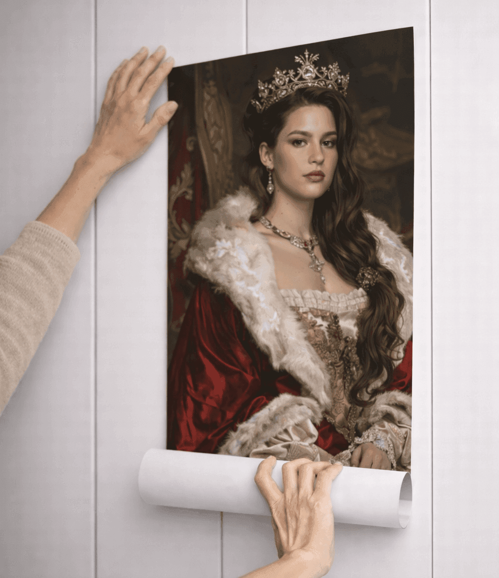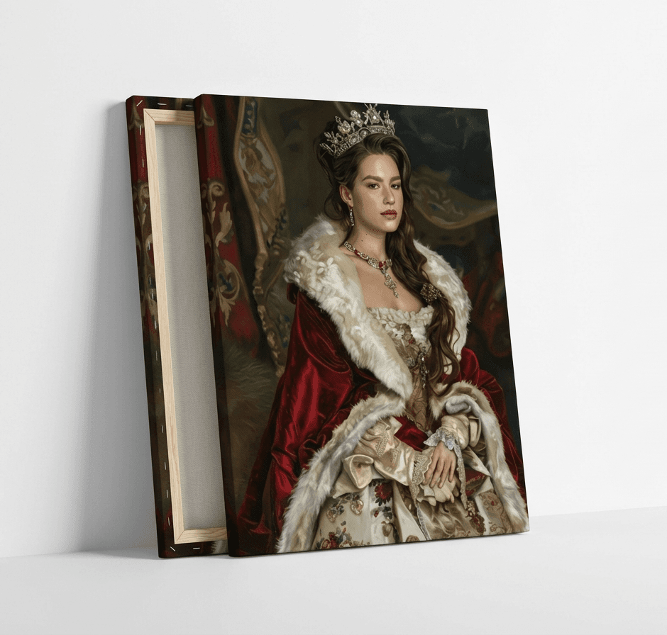 Превърнете своя снимка в изкуство с персонализиран портрет на жена в кралски стил. Нашите художници създават дигитални илюстрации с корона, трон, ренесансова или барокова рокля, които подчертават изящество и благородство. Идеален подарък за специален повод или елегантна декорация за дома.