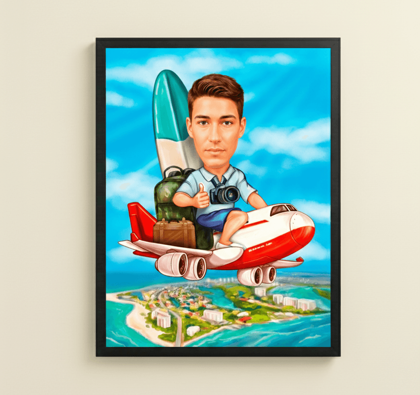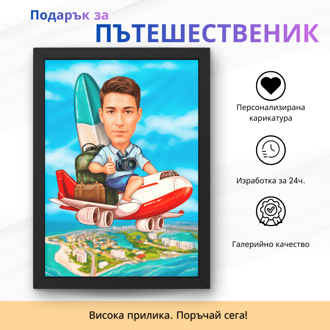 Превърни своя снимка или тази на приятел в оригинална карикатура на мъж турист, летящ върху самолет, с куфар и фотоапарат в ръка.