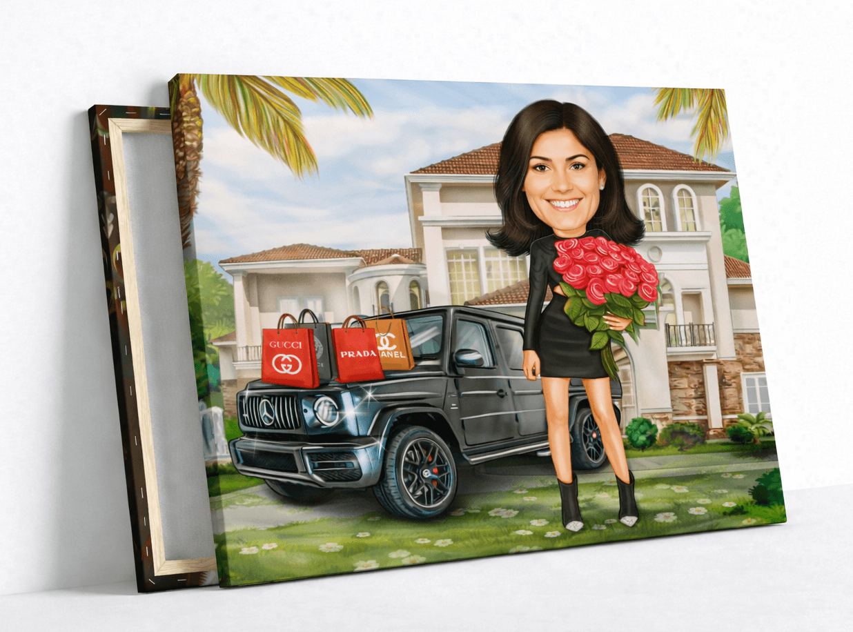 Поръчай персонализирана карикатура на елегантна жена в черна рокля, пред модерен джип и луксозна вила.