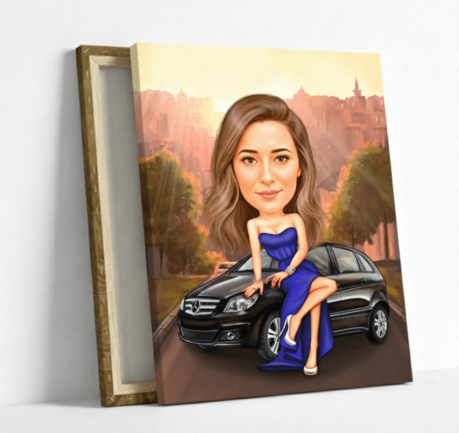 Създадена по твоя снимка, тази илюстрация улавя модерната и елегантна визия на жената, която знае какво иска. Подходяща за самоуверени дами, автомобилни фенки или като оригинален и запомнящ се подарък.