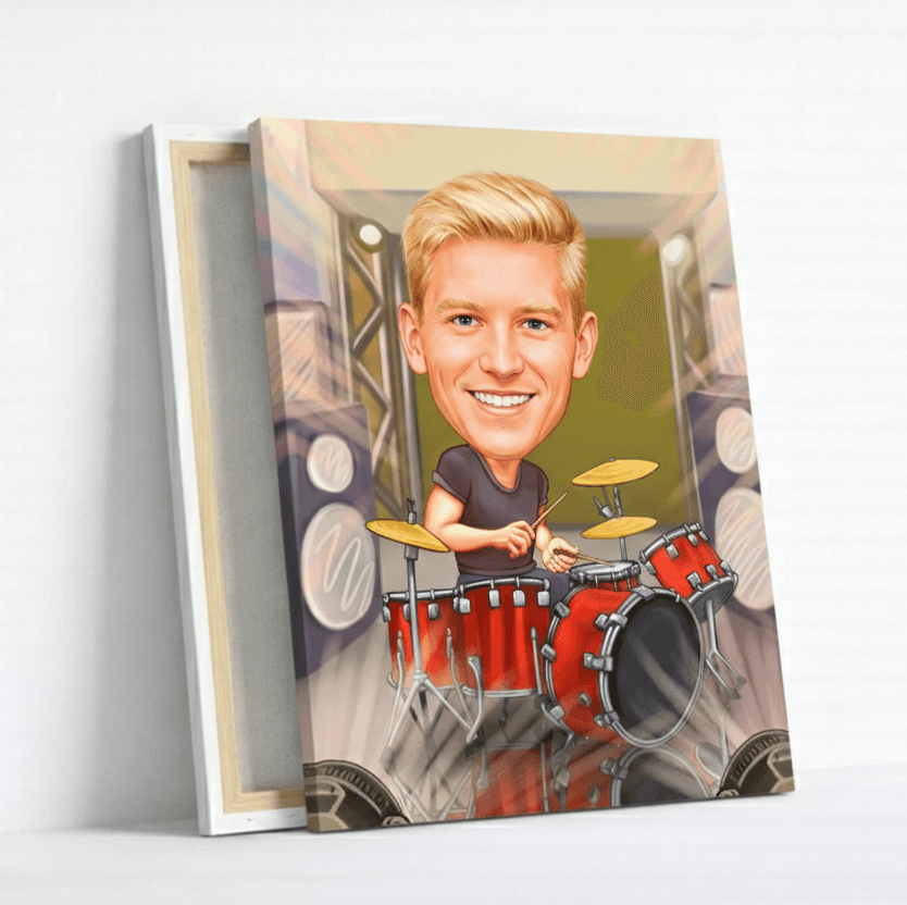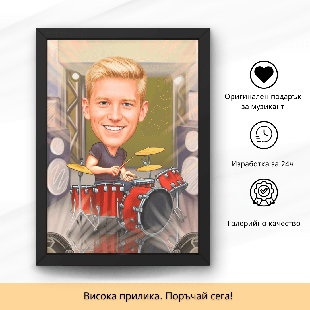 Подари оригинална карикатура по снимка на мъж, потънал в ритъма – с барабани, слушалки и студийна атмосфера.