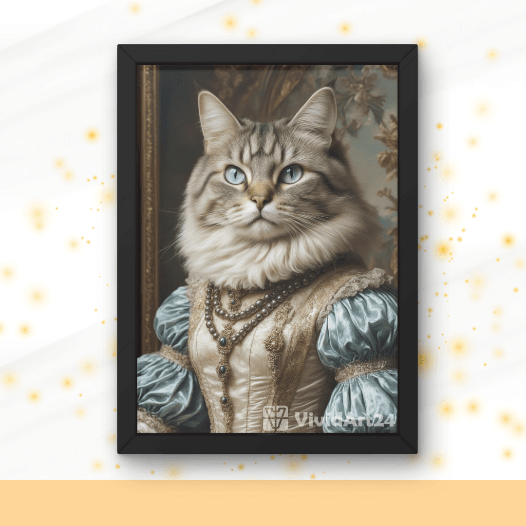 Превърни снимката на своята котка в изтънчен кралски портрет със сребриста рокля, перлено колие и барокова атмосфера.