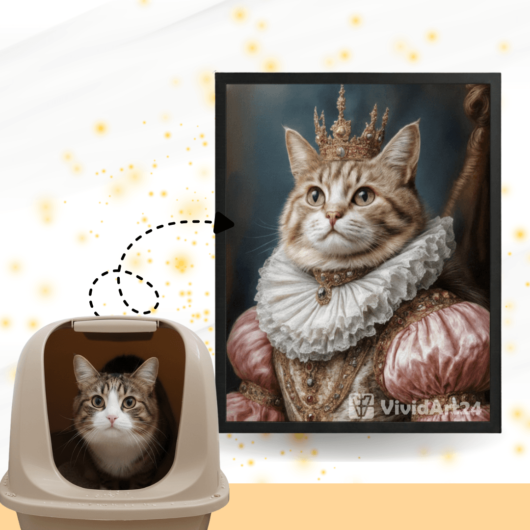 Превърни снимката на своята котка в изящен ренесансов портрет със златна рокля, бижута и кралска корона.