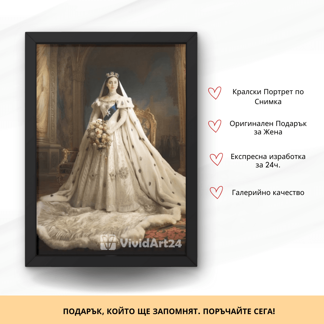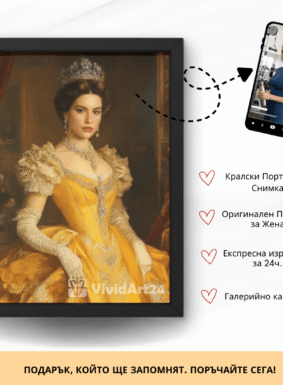 Превърнете своя снимка в изкуство с персонализиран портрет на жена в кралски стил. Нашите художници създават дигитални илюстрации с корона, трон, ренесансова или барокова рокля, които подчертават изящество и благородство. Идеален подарък за специален повод или елегантна декорация за дома.