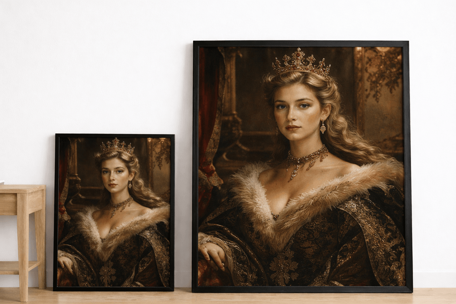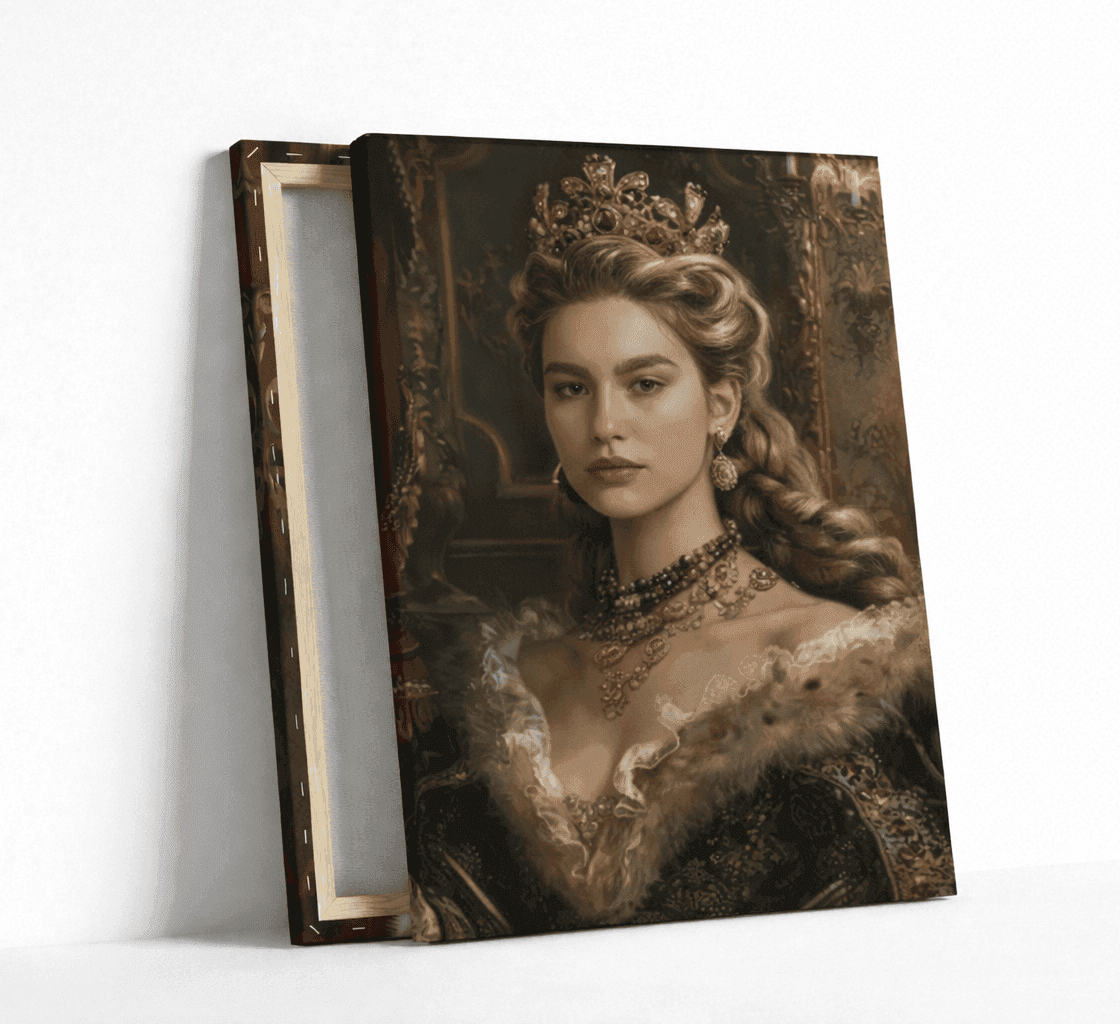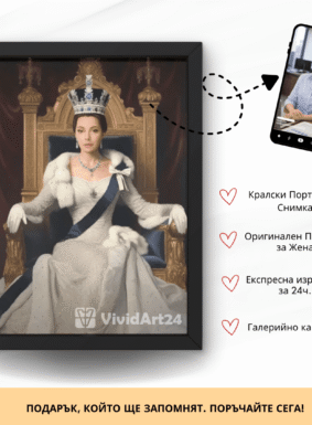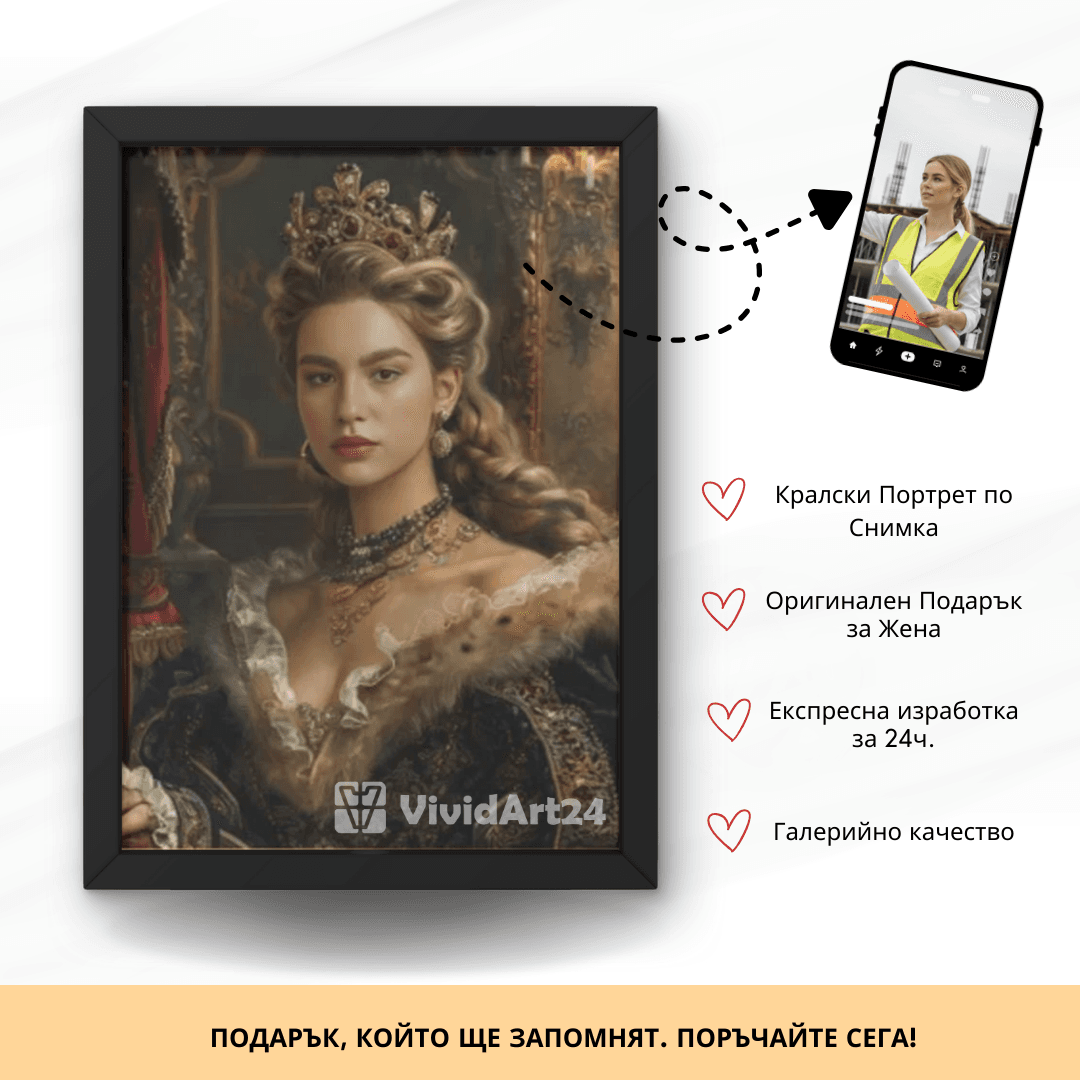 Превърнете своя снимка в изкуство с персонализиран портрет на жена в кралски стил. Нашите художници създават дигитални илюстрации с корона, трон, ренесансова или барокова рокля, които подчертават изящество и благородство. Идеален подарък за специален повод или елегантна декорация за дома.