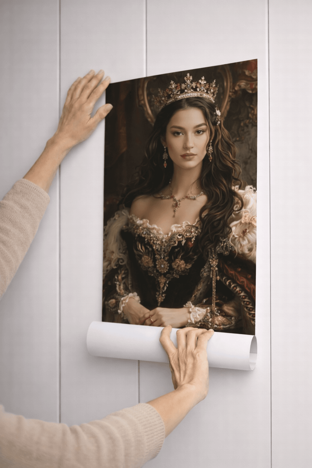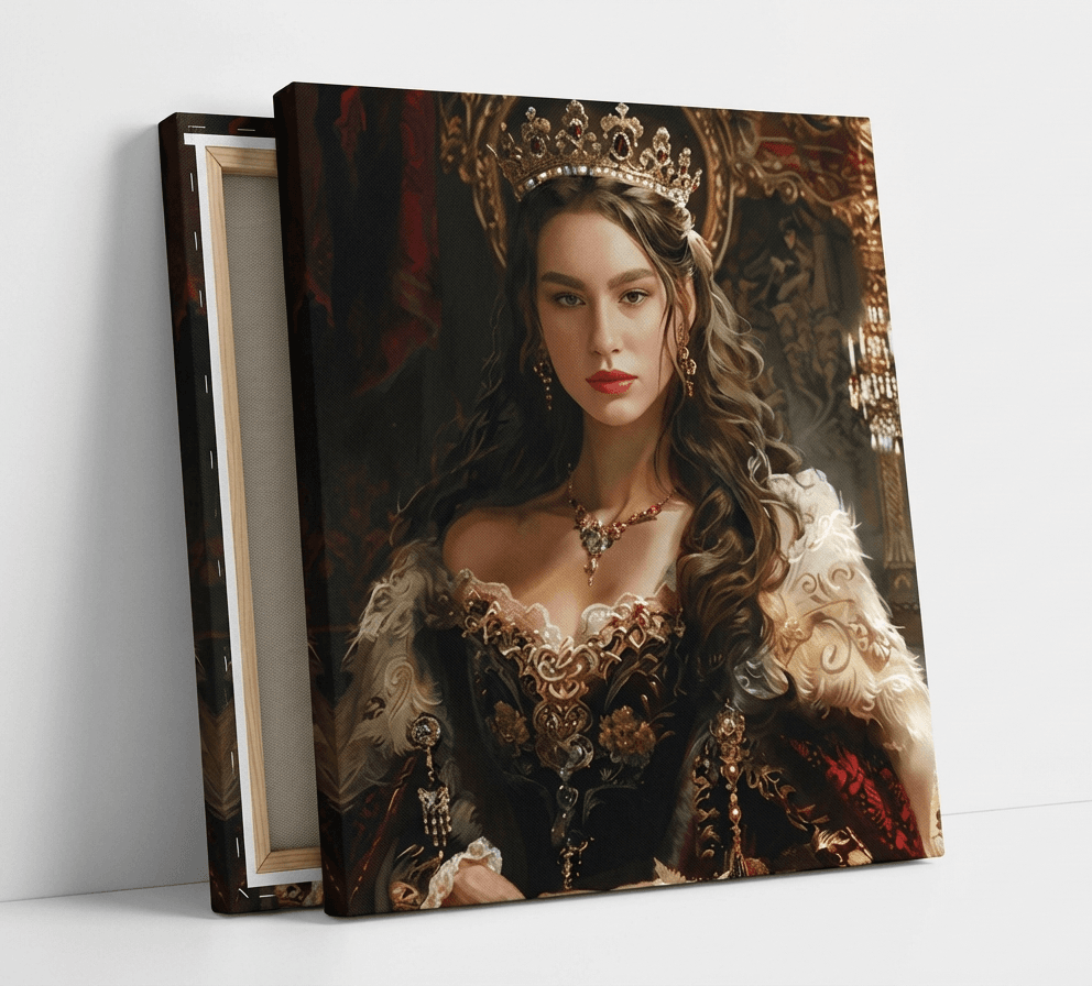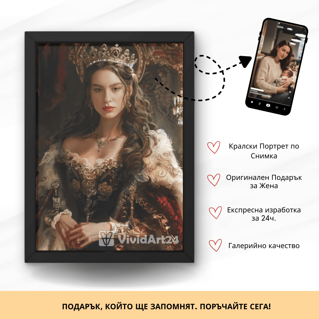 Превърнете своя снимка в изкуство с персонализиран портрет на жена в кралски стил. Нашите художници създават дигитални илюстрации с корона, трон, ренесансова или барокова рокля, които подчертават изящество и благородство. Идеален подарък за специален повод или елегантна декорация за дома.
