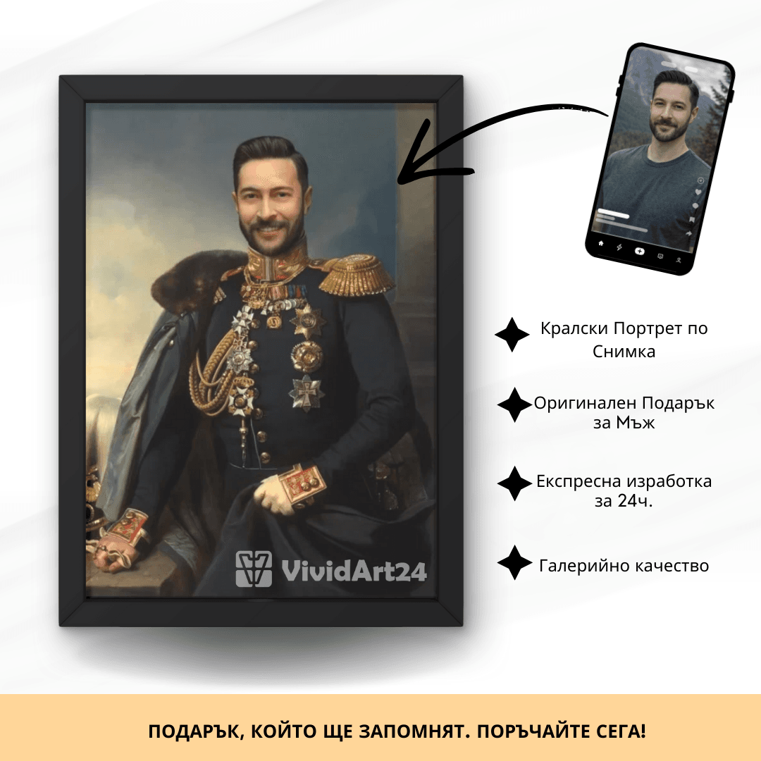 Превърнете снимка в изкуство с персонализиран портрет на мъж по снимка в кралски стил – създаден дигитално с внимание към детайла. Подходящ за подарък или уникална декорация, този портрет подчертава сила, стил и благородство
