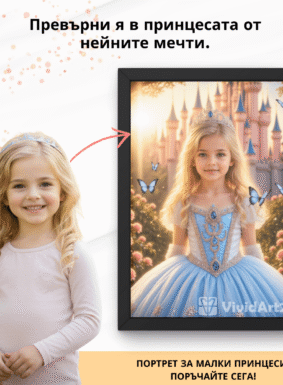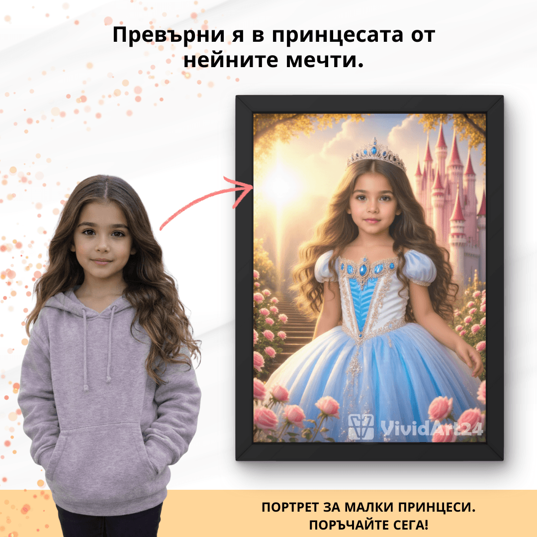 Изработен по ваша снимка в приказен стил, този портрет е идеален за малки принцеси, които мечтаят за магически светове.