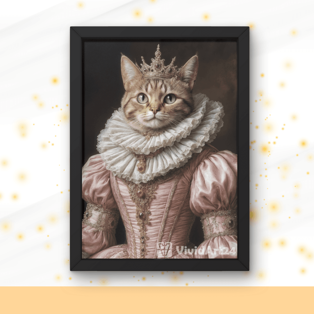 Превърни снимката на своята котка в елегантен портрет на кралица с розова рокля, златна корона и дантелена яка.