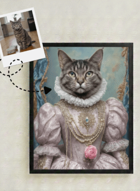 Превърни снимката на своята котка в елегантен портрет на кралица със златна корона, перлена яка и ренесансова рокля.