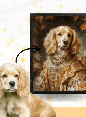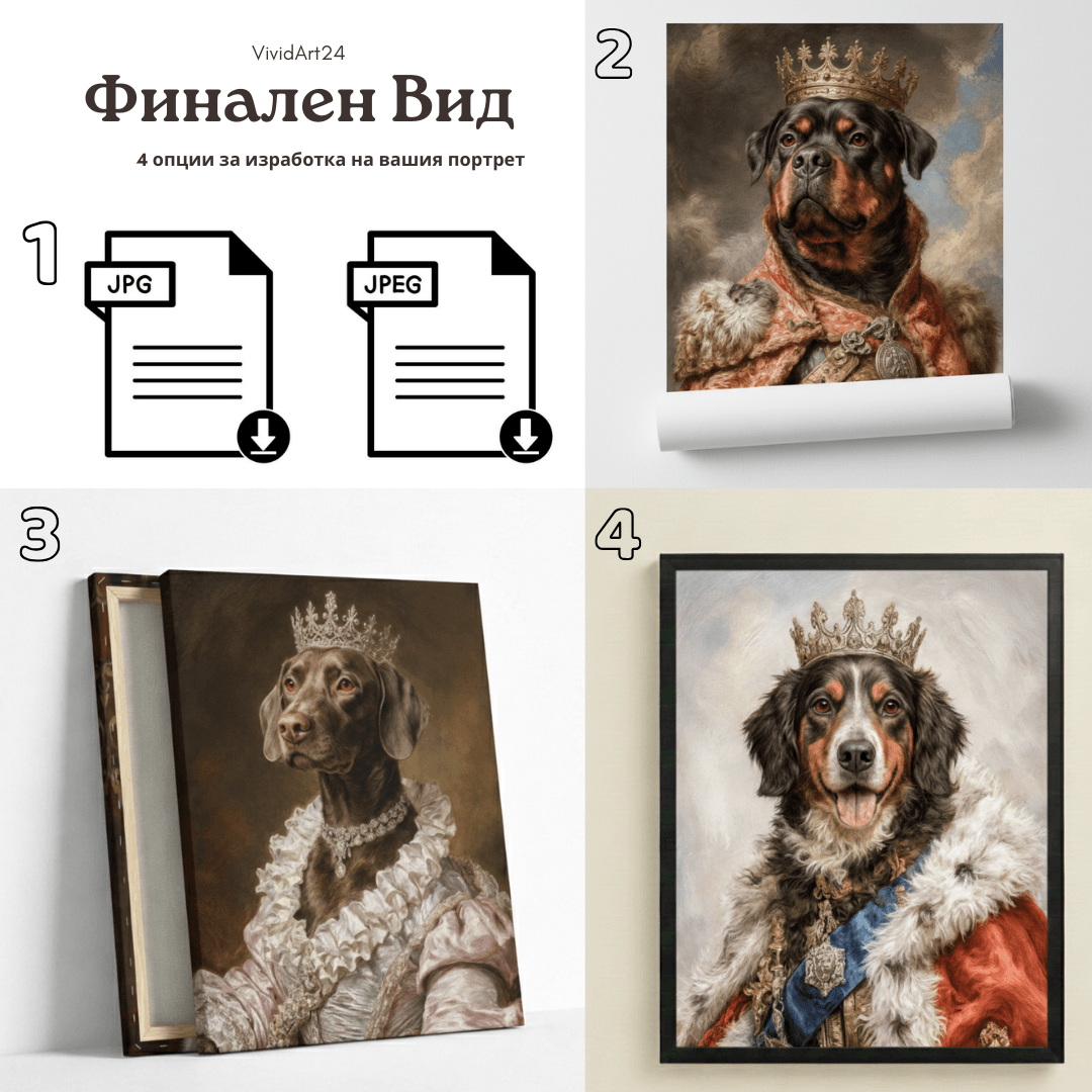 Превърни обикновена снимка в кралски арт портрет с изискано излъчване и златист фон. Идеален избор за оригинален подарък или стилна декорация за всеки любител на кучета.