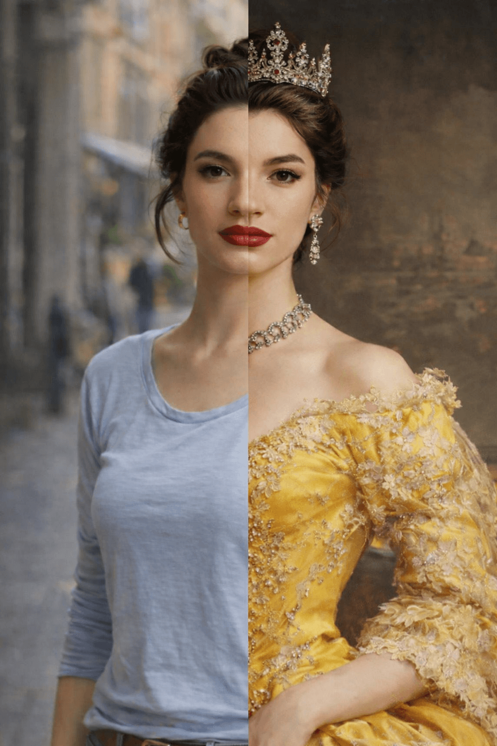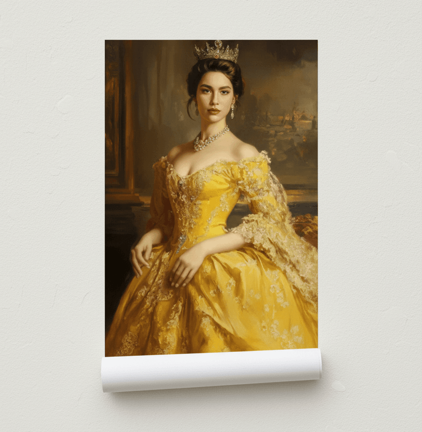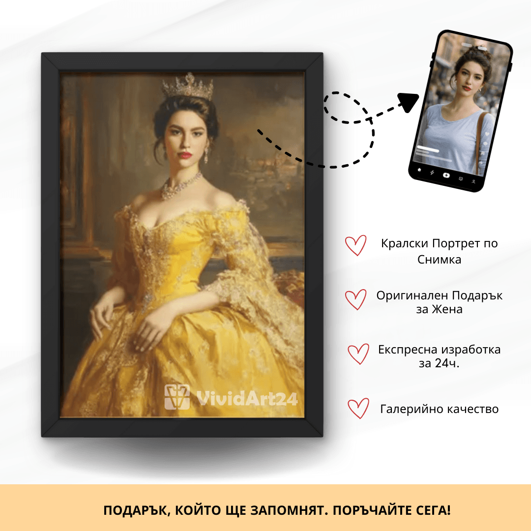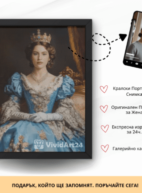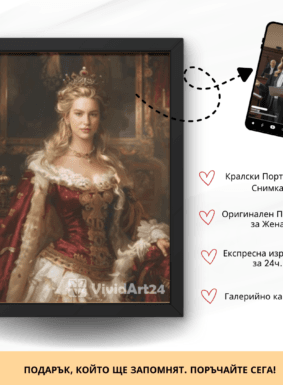 Превърнете своя снимка в изкуство с персонализиран портрет на жена в кралски стил. Нашите художници създават дигитални илюстрации с корона, трон, ренесансова или барокова рокля, които подчертават изящество и благородство. Идеален подарък за специален повод или елегантна декорация за дома.