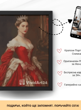 Превърнете своя снимка в изкуство с персонализиран портрет на жена в кралски стил. Нашите художници създават дигитални илюстрации с корона, трон, ренесансова или барокова рокля, които подчертават изящество и благородство. Идеален подарък за специален повод или елегантна декорация за дома.