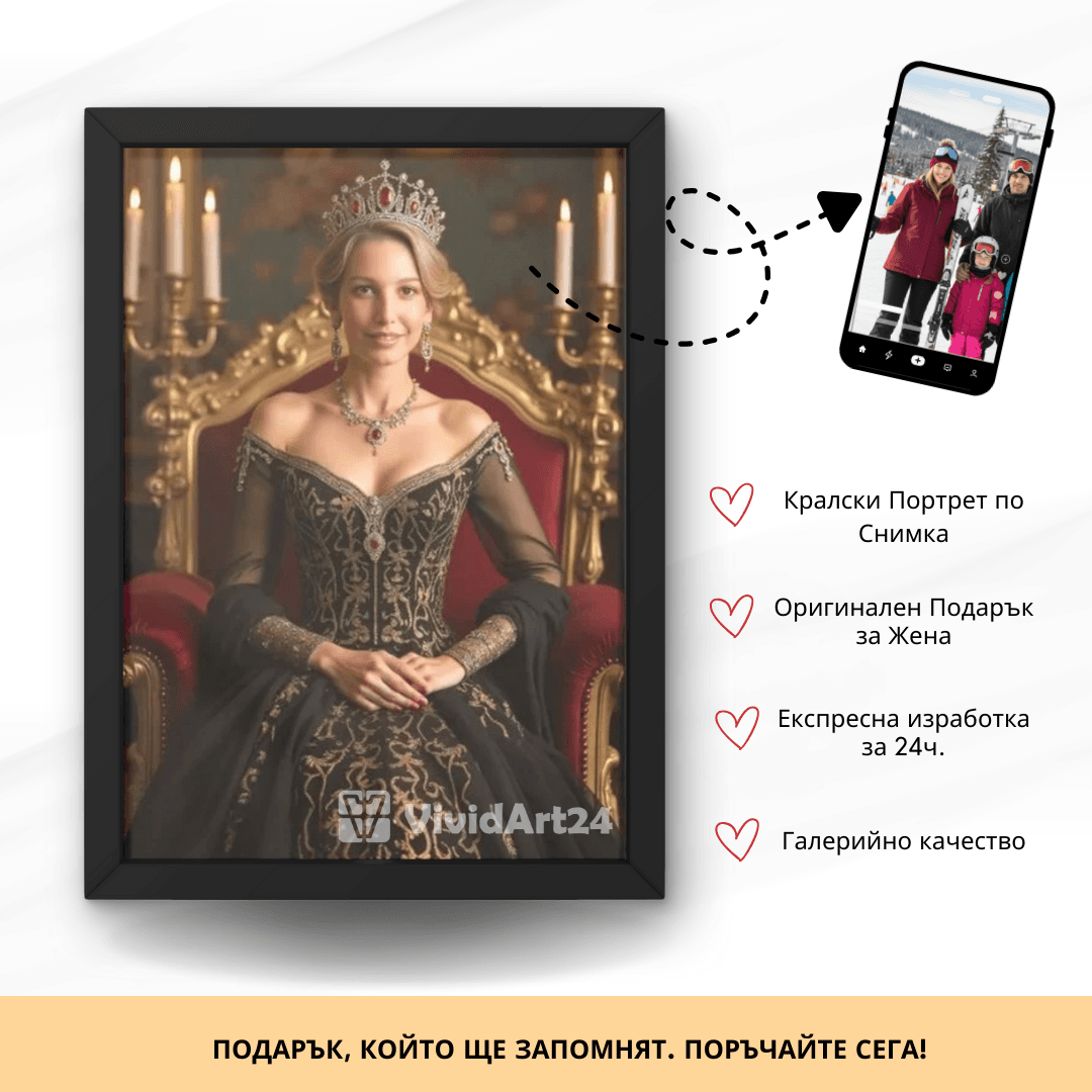 Превърнете своя снимка в изкуство с персонализиран портрет на жена в кралски стил. Нашите художници създават дигитални илюстрации с корона, трон, ренесансова или барокова рокля, които подчертават изящество и благородство. Идеален подарък за специален повод или елегантна декорация за дома.